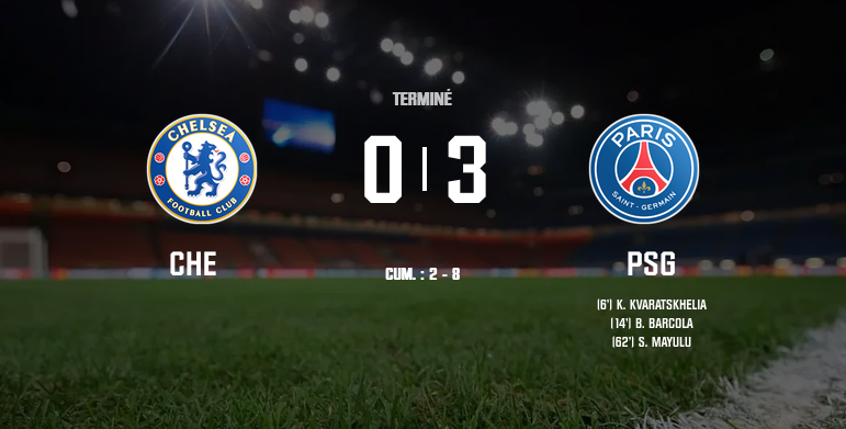 Après sa large victoire au Parc des Princes (5-2), le Paris Saint-Germain a nettement dominé Chelsea (0-3) au match retour ce mardi soir à Stamford Bridge. Grâce à trois bijoux de Kvaratskhelia, Barcola et Mayulu, les Parisiens rallient les quarts de finale de la Ligue des champions sans difficulté et entretiennent leur rêve d'un incroyable doublé.