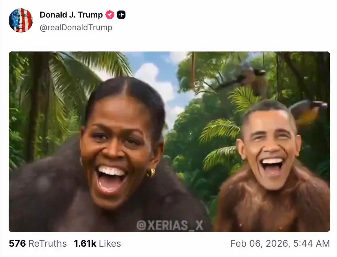 Acculé par le dossier Epstein où il apparaît plusieurs milliers de fois, Donald Trump a publié une vidéo IA où Obama et sa femme sont dépeints en singes dansants... Lunaire mais plus rien de surprenant. On sait depuis un moment qu’il est prêt à tout pour détourner les regards.